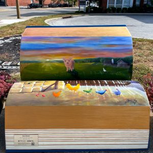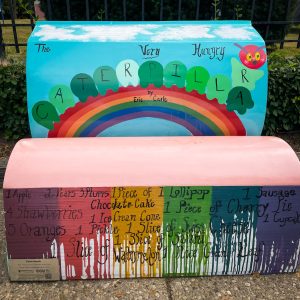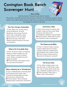 In 2023, the Library and the City of Covington unveiled beautifully painted book benches designed by talented local artists. Now that spring is here, it's the perfect time to get outside, explore and discover these literary works of art! Use the sheet below for a scavenger hunt.
