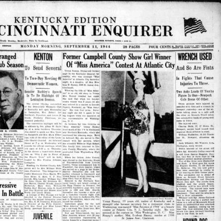 Venus Ramey appeared on the front page of the Kentucky Edition of the Cincinnati Enquirer on September 11, 1944 after winning the Miss. America contest in Atlan