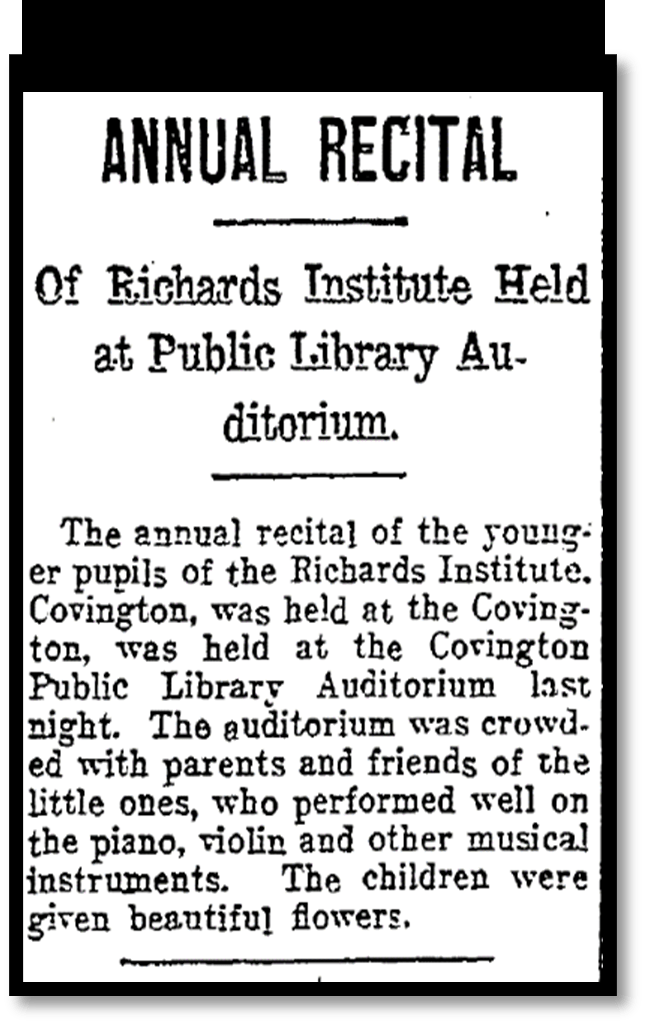 Women faced huge hurdles to become business owners at the turn of the twentieth century. Those hurdles didn’t stop Susan Richards from making her dream a reality. It was an era when most music was enjoyed by live performances. Although recorded sound technology was emerging and, within a decade, would be universally available, families still encouraged their children to learn to play an instrument. Music instructors were numerous and valued in Covington. Susan Richards was one of many instructors listed in the city directory.