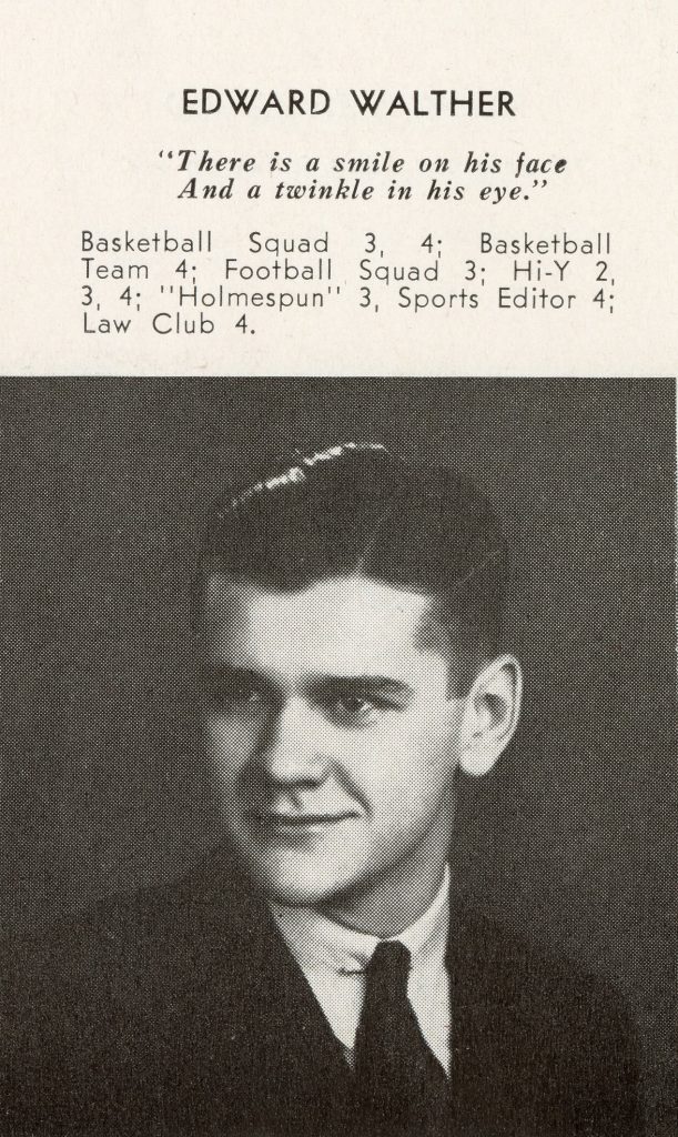 Edward Alfred Walther was born September 5, 1922 in Kenton County, Kentucky to Edward Walther and Helen Miller. He had three brothers William, Robert, and Donald. William and Donald died as infants. Walther attended Holmes High School and graduated in June of 1940 (in the same class as Ford). Walther served as a Fire Controlman Third Class on the U.S.S. Arizona. His mother Helen Walther received flowers from her son on Christmas Eve a few weeks after the December 7th attack on Pearl Harbor. She had been notified of Walther’s death, and she contacted the florist who delivered the flowers to learn that Edward had ordered them on December 6, one day before his death.