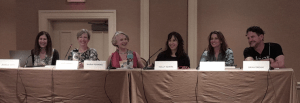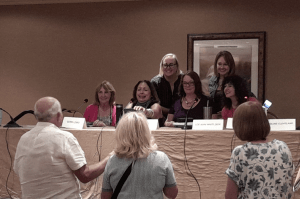 Audiobook narrators and professionals at Bouchercon. Left to right: Jessica Kaye, moderator; Andi Arndt, Marni Penning, Holly Adams, Amanda Stribling, and Brian Keany.