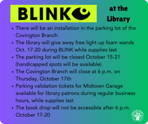 Start your BLINK adventure at the Covington Branch to ensure that the only loophole you encounter is the installation in our parking lot. The installation is titled Loophole and is coming from Spain. Library staff will be near the parking lot with a community art project attendees can participate in and giving away light-up foam wands while supplies last.